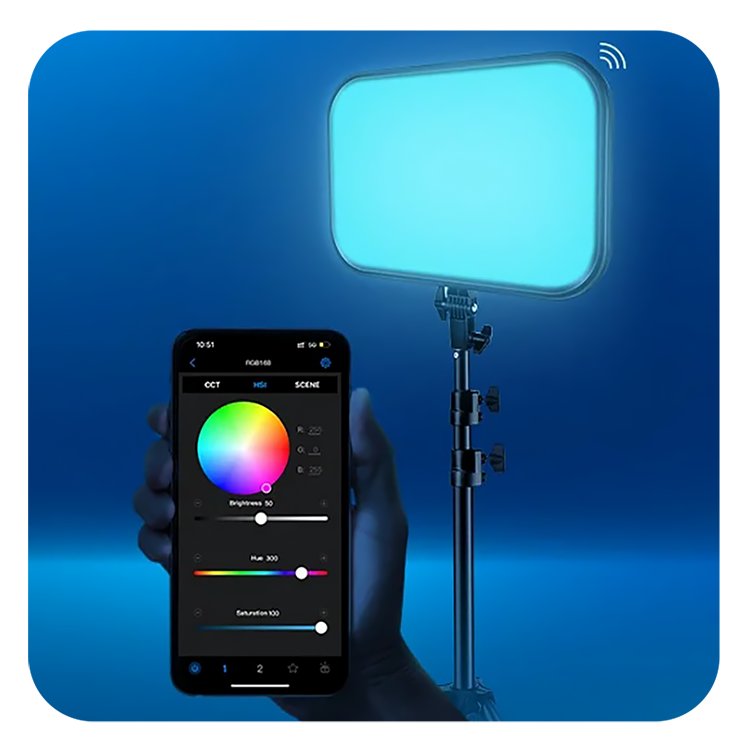 ![]() | Готовый комплект RGB освещенияПолноцветная RGB панель с выходной мощность 60 Вт поможет сделать ваш контент разнообразным и актуальным. Высокий индекс цветопередачи 97+ и TLCI 97+ гарантирует точную цветопередачу на площадке. Оттенок цвета регулируется в диапазоне от 0 до 360°, яркость — от 0 до 100%, а цветовая температура варьируется в широком диапазоне 2500 — 8500 K |