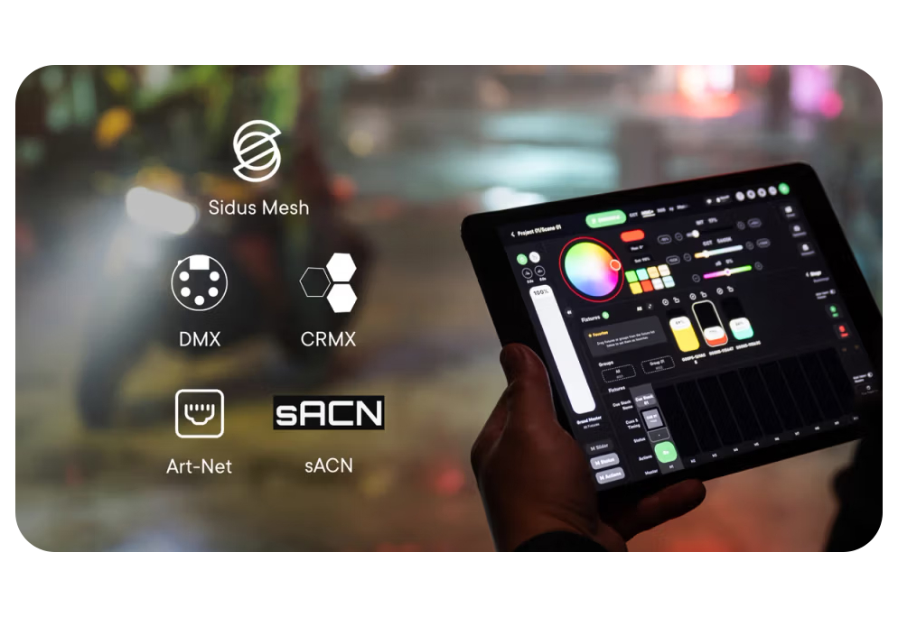 | Способ управления | Art-net, CRMX, DMX/RDM, sACN etherCON, панель управления на блоке контроля, приложение Sidus Link app, приложение Sidus Link Pro app |
