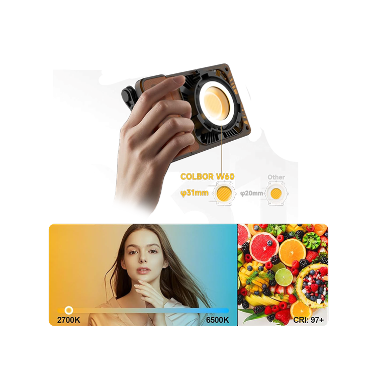 Портативный светодиодный осветитель в формфакторе фотокамеры с мощностью 60 Вт, создающий яркое и равномерное освещение. Диапазон цветовой температуры от 2700K до 6500K и высокий индекс цветопередачи CRI 97 гарантируют точную и естественную передачу цветов. Устройство обеспечивает освещенность 2890 люкс на расстоянии 1 метра без отражателя, имеет регулируемую яркость от 0% до 100% и угол светового потока 120°
