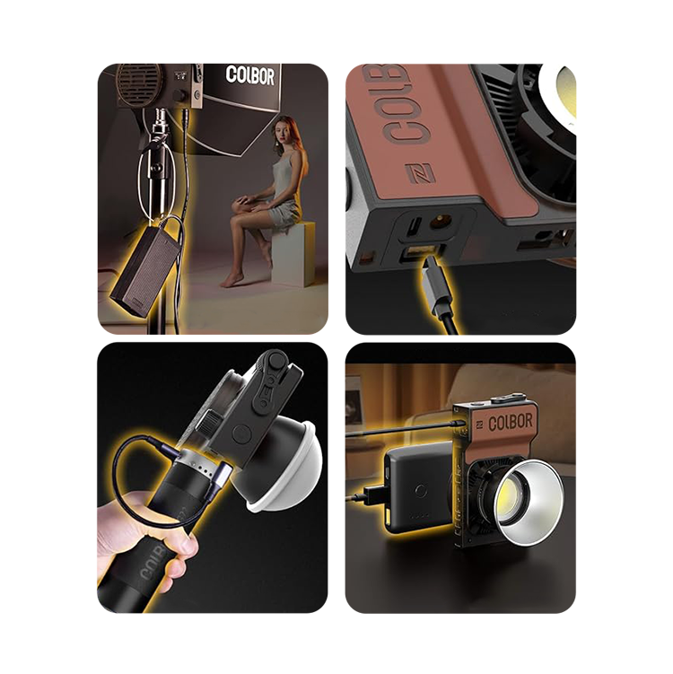 Осветитель поддерживает различные варианты питания, включая стандартный DC адаптер, аккумуляторная рукоятка Colbor (приобретается отдельно), а также быструю зарядку через PD Type-C посредством внешнего аккумулятора
