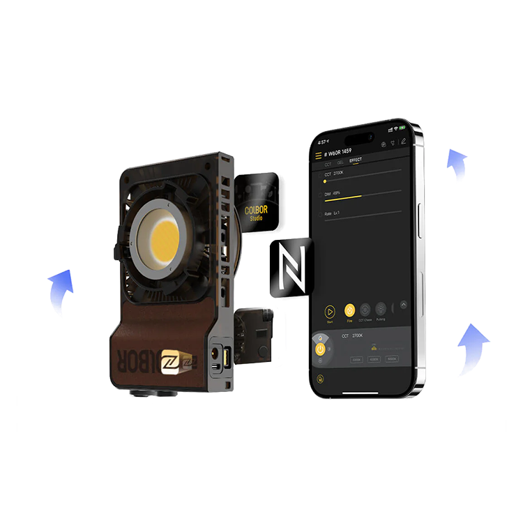Управление устройством осуществляется через приложение COLBOR Studio, что позволяет легко настраивать параметры освещения и использовать функции NFC для быстрого подключения