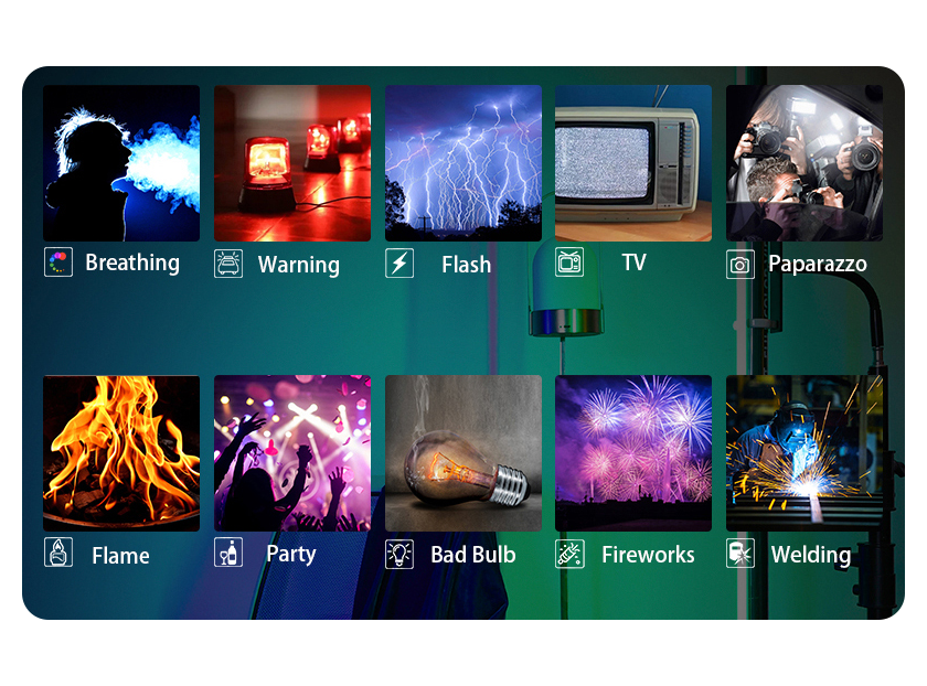 | FX режимы | CCT Cycle, Color Cycle, Faulty bulb/Bad bulb, Fire/Campfire/Bonefire, Fireworks, Flash, Paparazzi, Party, RGB Breathing, SOS, TV, Welding/Electric Soldering |