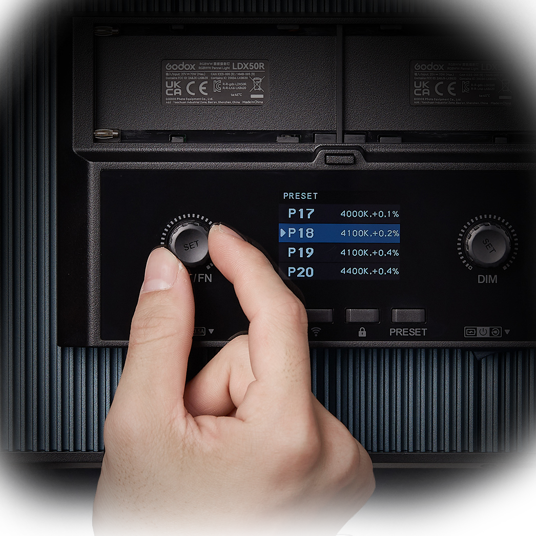 Для удобства быстрой настройки освещения в осветитель была добавлена функция предустановки до 10 пресетов с предварительно настроенными параметрами, что экономит время и позволяет быстро установить нужные параметры без необходимости ручного ввода
