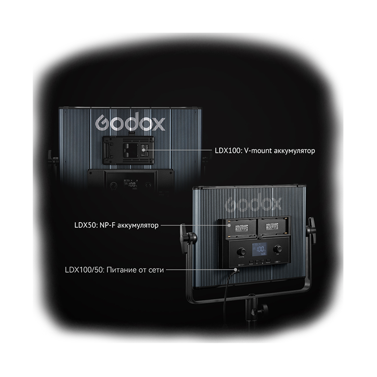 Осветитель может питаться от сети (20В 6А) либо от сменных батарей автономно. Для модели LDX50 это две батареи NP-F, а для LDX100 - один аккумулятор V-mount