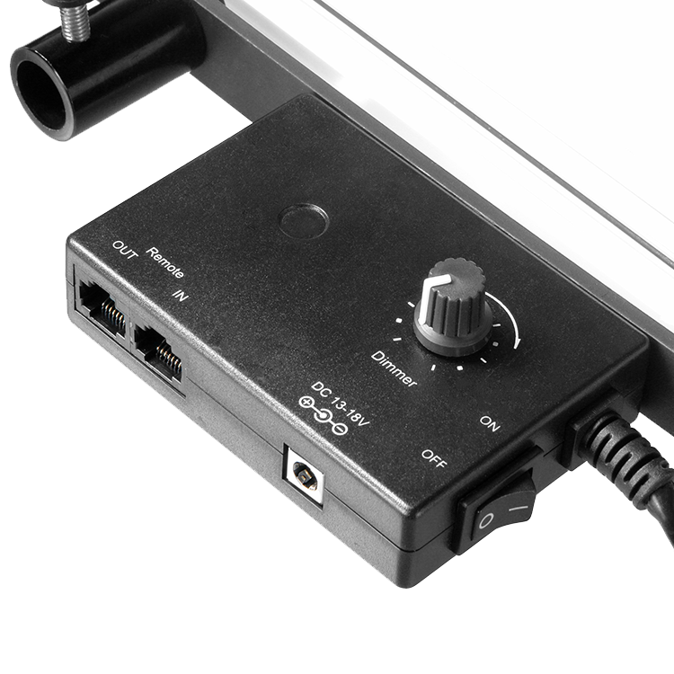 Производить настройку и управлять устройством можно с помощью вынесенного модуля управления, смонтированного на кронштейне. На нем расположен диммер для регулировки мощности, выключатель, а также порты. Производить управление возможно и с пульта, который позволяет регулировать мощность группы осветителей