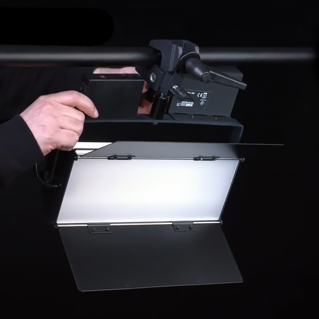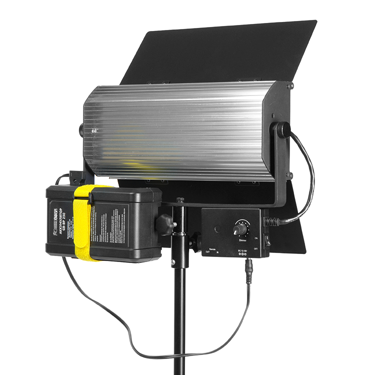 Осветитель работает от сетевого адаптера, а также от батареи с выходом D-Tap. Входящая в комплект лента помогает надежно зафиксировать аккумулятор на U-образном кронштейне. Наклонный кронштейн дает возможность установить лампу на стойке или подвесить с помощью потолочной системы