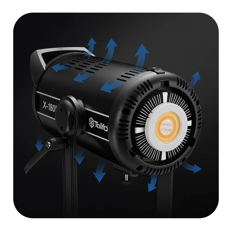 Интеллектуальный режим охлаждения позволяет автоматически регулировать скорость вращения вентилятора в зависимости от температуры. Все вырабатываемое тепло рассеивается, что позволяет значительно продлить срок службы осветителя. Осветитель также имеет функцию отключения звука одной клавишей, что позволяет выключить вентилятор, обеспечивая тишину для видеосъемки