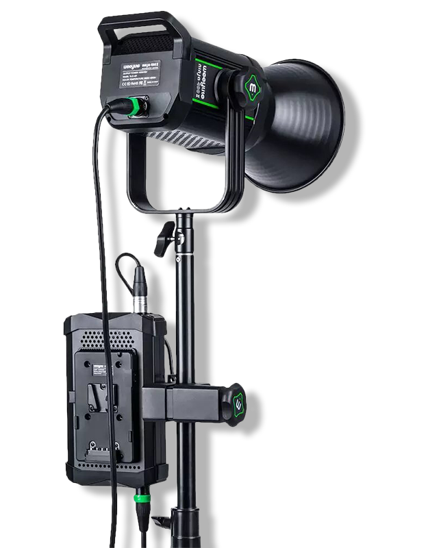 Блок управления с дисплеем вынесен из корпуса для более комфортной настройки уже установленного на стойку осветителя. К нему можно подключить питание от сети или от аккумулятора, а также синхронизировать осветитель по DMX. Обновленная конструкция крепления даёт моноблоку свободный поворот на 360° без насадок, что позволяет выбрать любой угол наклона и положение