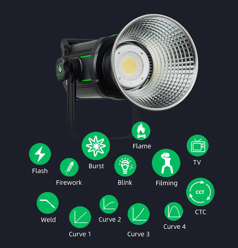 Аппарат выдаёт 150 Ватт мощности и имеет плавную регулировку цветовой температуры от 2800 до 6800 К. В функционал встроены 13 режимов освещения для создания визуальных эффектов на видео