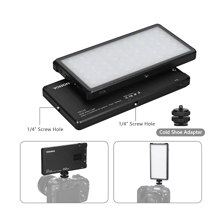 ![]() | Осветитель YN135RGB оснащен адаптером для крепления типа "холодный башмак" и имеет два резьбовых отверстия под винты ¼ для установки на различные держатели. Его компактные размеры и вес - всего 210 г, что делает устройство крайне легким и удобным в использовании при различных условиях |