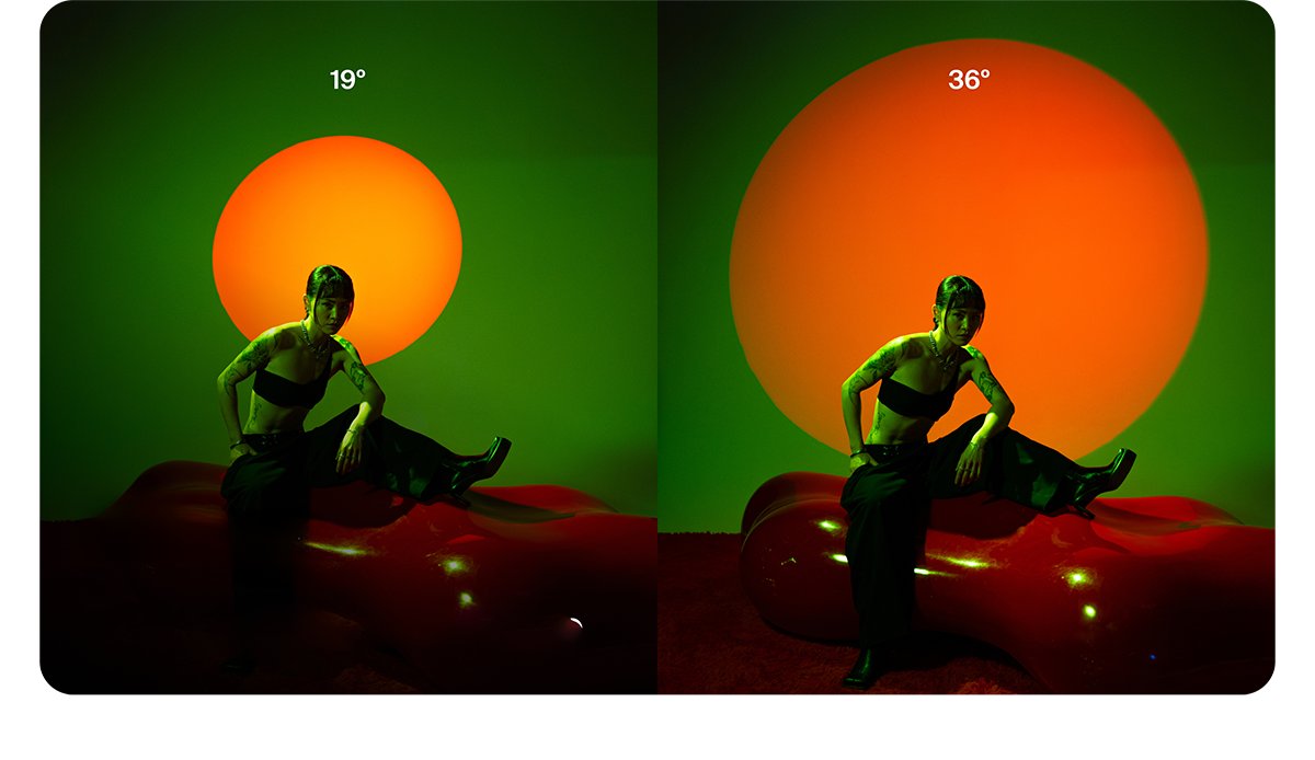 Две сменные линзы (19° и 36°) регулируют размер и фокус луча. Дополнительная диафрагма (опционально) тонко контролирует ширину луча без замены оптики. Интегрированный 4-лепестковый затвор, рамка для светофильтров и мягкий кейс для переноски обеспечивают готовность к проекционным задачам любой сложности в студии или на локации