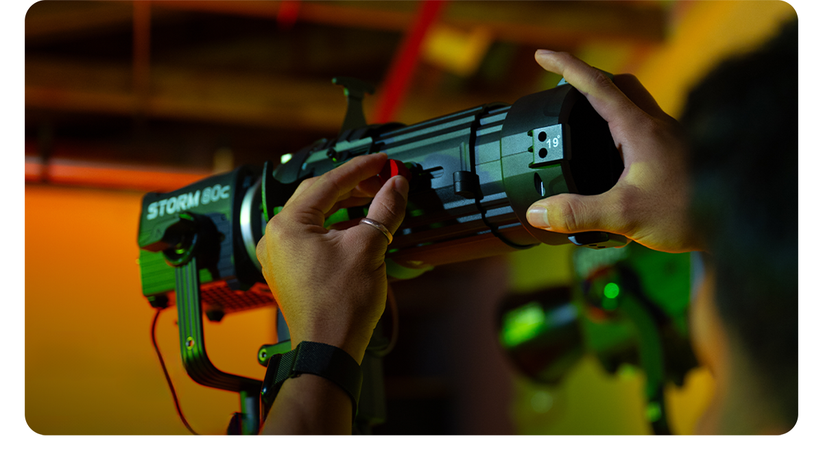Проекционная насадка Aputure Spotlight mini разработана исключительно для осветителя STORM 80c, используя фирменное крепление Mini ProLock Mount для точного позиционирования. Ее компактная цельнометаллическая конструкция с тщательно рассчитанной оптикой создает равномерный луч без хроматических аберраций и сдвига цвета, эффективно преобразуя свет чипсета BLAIR-CG. Вращающийся ствол позволяет менять ориентацию масок Гобо без их извлечения, что критично для оперативной работы в ограниченном пространстве