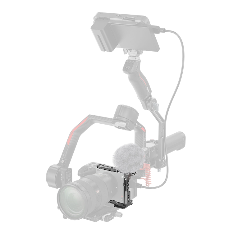 Базовая пластина клетки поддерживает крепление к стабилизаторам DJI RS 2, RSC 2, RS 3/3 Pro, RS 4/4 Pro и штативам с системой Arca-Swiss, обеспечивая мгновенную фиксацию без дополнительных адаптеров. Множество точек крепления включает: резьбовые отверстия 1/4", позиционируемые отверстия ARRI 3/8", холодный башмак, рельсу NATO и QD-разъем для установки ручки, микрофона, светодиодной панели или монитора
