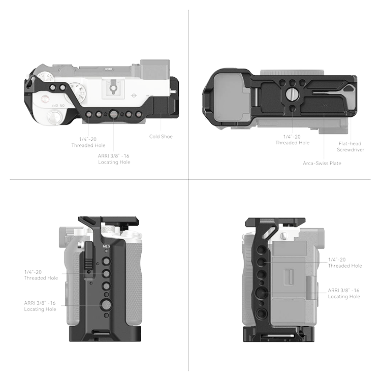| Облегченная версия клетки для Sony A7C. Не препятствует свободному доступу к интерфейсу камеры, всем кнопкам управления и батарейному отсеку. В нижней части имеется винт 1/4" для надежной фиксации камеры. Клетка имеет резьбовые отверстия 1/4" и 3/8" и крепление на холодный башмак, крепление ARRI для монтажа аксессуаров |
