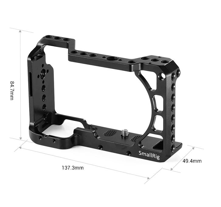 Профессиональная клетка для камер Sony A6300/A6400/A6500. Конструкция имеет множество отверстий 1/4" и 3/8", что позволяет установить дополнительное съёмочное оборудование, для повышения качества и эффективности работы