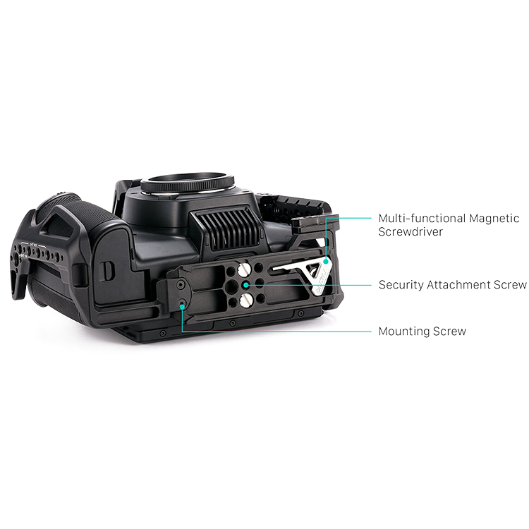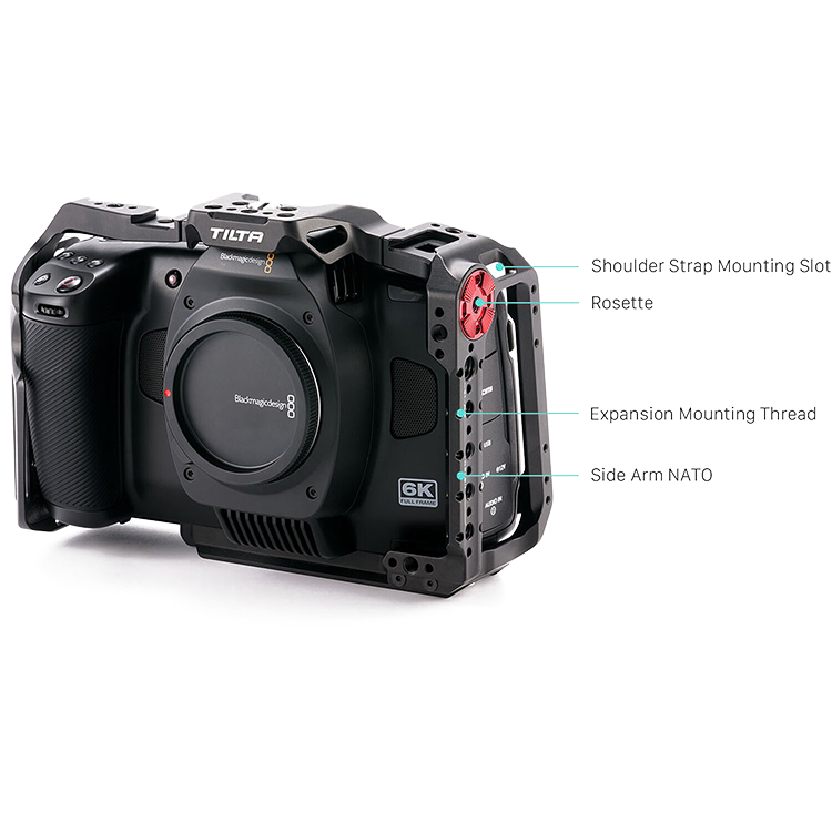 | Клетка для камеры Blackmagic Cinema Camera 6K обеспечивает защиту корпуса камеры и позволяет закрепить различные аксессуары для улучшения функциональности камеры. Конструкция имеет несколько отверстий 1/4" с фиксирующими штифтами, холодный башмак, ARRI Rosette, а также направляющую NATO Rail для боковых ручек и аксессуаров |