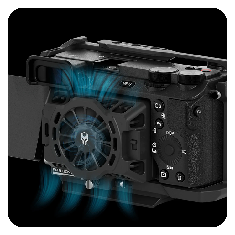 Портативная система охлаждения поможет при длительной съёмке защитить камеру от перегрева. Гаджет можно установить в свободный слот для дисплея, а питание подключить по Type-C. Предусмотрена регулировка мощности, что поможет при записи звука со встроенного микрофона | ![]() |
