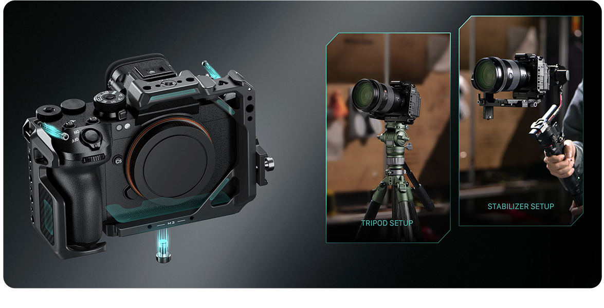 Система трансформируется из полной клетки в полуклетку за счет отсоединения передней секции (4 винта), адаптируясь под съемку с компактными ригами или стабилизаторами. В комплекте — специализированные зажимы для HDMI-кабелей, фиксирующие разъемы для Sony a1 II и a9 III отдельно, что исключает повреждение портов при подвижной съемке. Дополнительная базовая плата с прорезями для провода (опционально) организует кабели Type-C, аудио и LAN. Совместимость с аксессуарами расширяет функционал для профессионального видео