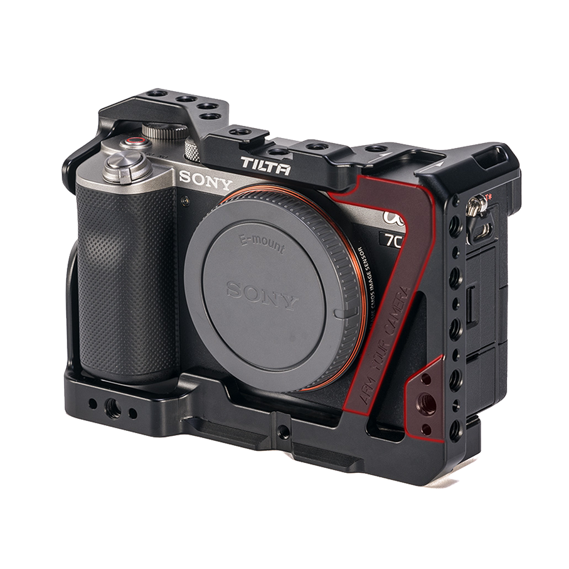 Клетка для камеры Sony a7C позволяет оснастить устройство дополнительными приспособлениями для повышения качества и комфорта работы. Множество отверстий 1/4" и холодный башмак открывают простор для вариативных сборок