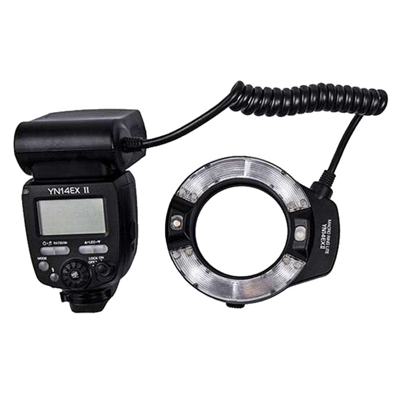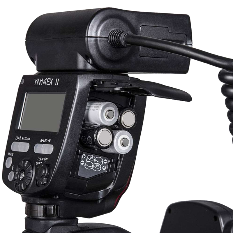 YongNuo YN14EX II имеет настройки мощности ламп A и B, вплоть до полного отключения одной из них. Во время фотосъёмки это позволяет создать эффект объема или тени. Яркая светодиодная лампа подсветки автофокуса позволяет сфокусироваться даже при съемке в темное время суток. Модель оборудована стандартным 2,5 мм интерфейсом для синхронизации через специальный кабель