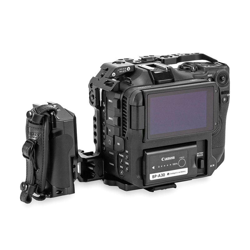 | Функциональный комплект для камеры Canon C70 из клетки и наклонной левой рукоятки с функцией пуска. Дополнительно предусмотрен ремешок для надежного хвата. Клетка имеет резьбовые отверстия 1/4" и ARRI 1/4", крепление на холодный башмак для установки дополнительных аксессуаров |