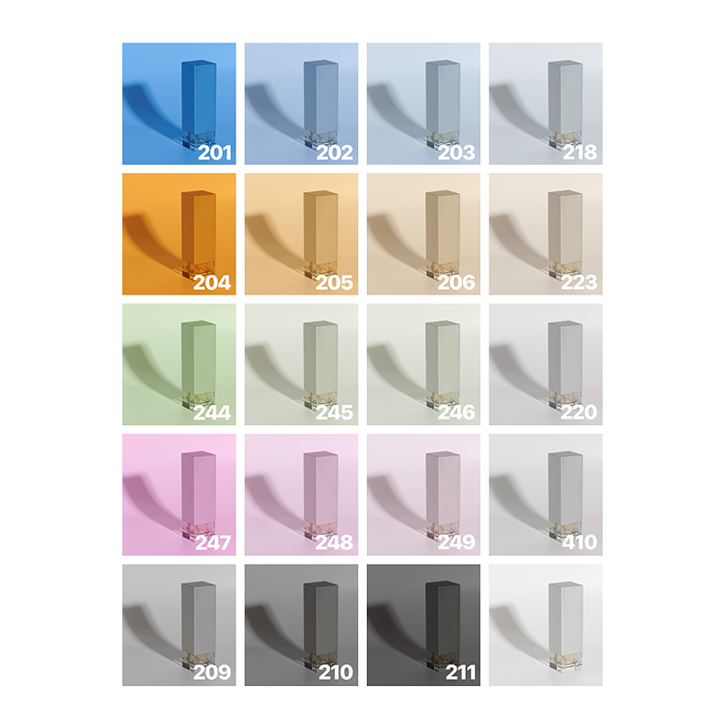 В наборе представлены фолиевые/гелевые фильтры с различными коэффициентами понижения: от 1/8 до 2 ступеней. Это дает возможность точно настроить освещение под конкретные задачи и условия съемки.