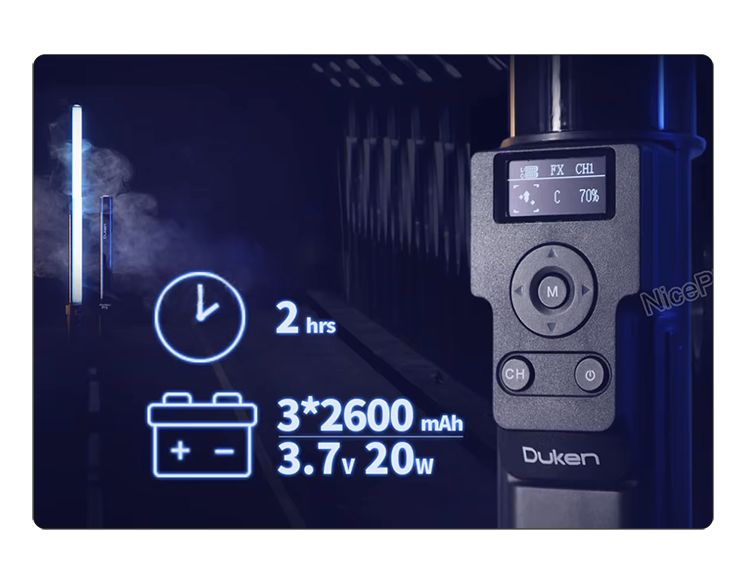 Лампа оснащена тремя встроенными аккумуляторами, обеспечивающими до 90 минут автономной работы на полной мощности, что идеально подходит для съемок на улице. Порт Type-C позволяет зарядить устройство с помощью обычного зарядного устройства для телефона, без необходимости использования громоздких адаптеров