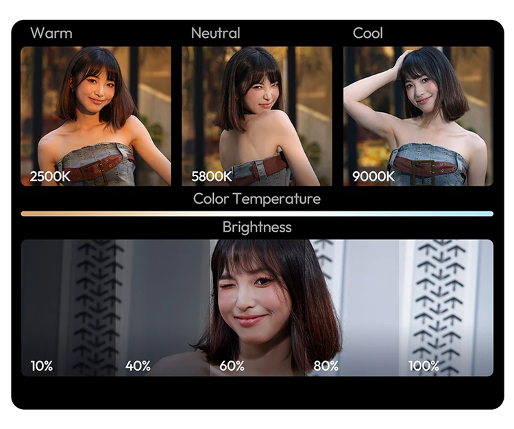 Настройки для лучшего кадраПрибор оснащен светодиодной матрицей с регулировкой цветовой температуры от теплых 2500K до холодных 9000K, что позволяет точно соответствовать окружающему освещению. Яркость плавно настраивается от 10 до 100 %, а освещенность достигает 160 люкс на расстоянии 0,5 метра. Для дополнительного удобства в конструкцию встроено зеркало, позволяющее контролировать свой образ прямо во время съемки | ![]() |